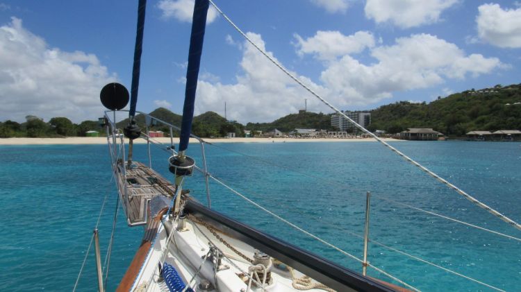 After a short afternoon sail from Jolly Harbor, we dropped the hook in Hermitage Bay. Hermitage Bay as its web site writes is a “…sensitively developed resort [that]celebrates the peace, warmth, and extraordinary natural beauty of the Caribbean”. Well, who could object to that! Not I for one.