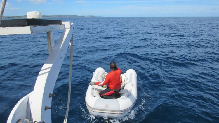 We lowered our boarding ladder and Angus hung on and gave us the telephone number of Julia. We called and he explained the situation. Apparently, she could see our boat but she could not tell us where she was. He climbed into our dinghy, which we were towing behind us. We took the outboard off when we left Great Bird as we don’t sail in the ocean with engine on the dinghy. If we had the engine, I could have dinghied him back behind the reefs. He decided that he could swim back (with the bag of lobsters he caught) and go over the reef. He assured us he would be fine.