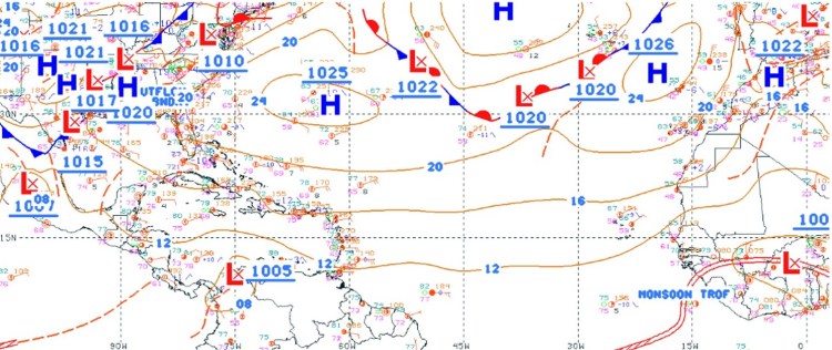 For the technical reasons why these winds were “up”, one must look at the bigger picture. The trades are driven by differences in air pressure. High pressure (H) north of the islands and low (L) pressure over the north coast of South America drives the strong easterly flow of winds. This is a three-dimensional chess game. We are at the bottom of the active air mass that extends to over 50,000 feet above us. The trades are only in the bottom10,000 feet. And we live in the very bottom 50 feet! Above that 10,000 foot level, the wind is normally out of the west. This winter’s snowstorms in the U.S. this impacted this pressure pattern up until February. That was not unusual. The high pressure north of the islands was pushed aside and lighter trades winds developed. This changed by the end of February and high pressure returned to the mid-Atlantic and has been driving the trades ever since.